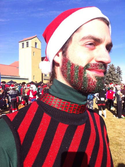 Nick and his glitter-tastic beard impressed us today at the Ugly Sweater 5K fun run in City Park. Nick, who is originally from Idaho, has been known to glitterize and otherwise accessorize his beard for multiple occasions, and he didn’t disappoint today; among the many bearded dudes (and ugly sweaters) in the park, he stood out above the rest. He’s had his beard for the better part of the past four years, and we sure hope he continues to glitterize it for years to come!
