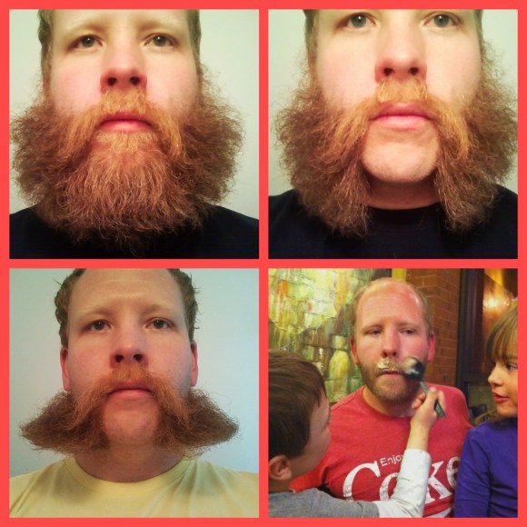Every once in a while it is the joy of the Beard Huntress to happen upon a handsome bearded man who is willing to share the various stages of change his beard goes through. Such was the case when we were fortunate enough to run into Mr. Johnny Moses. Johnny is one of our favorite Denver beards–a native–and was kind enough to share with us the evolution of his beard, which happened over the span of four or five months this year. Johnny works both at the Elm bar and restaurant on East Colfax and Elm in Denver, as well as at Park Hill Methodist preschool, and is shown in the bottom right being given the infamous Ice Cream ‘Stache by some of his students. When Johnny’s not molding the minds of our great city’s youth, or rubbing elbows with the locals at the Elm, he plays in the Denver band I Sank Molly Brown. I said it before and I’ll say it again, Holy Moses, Johnny! We love your beard.